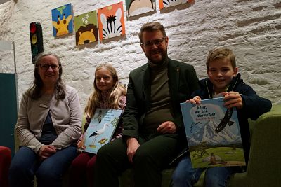 Die zwei Hauptgewinner der Bücherrallye der Stadtbücherei im Kornkasten stehen fest. Die beiden Kinder hatten beim Quiz zur Ausstellung rund um die Natur vor unserer Haustür mitgemacht. Von 4. bis 29. November waren dazu im Erdgeschoss großformatige Illustrationen aus ausgewählten Sachbilderbüchern von Kinderbuchautor Thomas Müller ausgestellt. Beim Quiz galt es, zwölf Fragen zum Thema Natur richtig zu beantworten, um das Lösungswort zu erhalten.