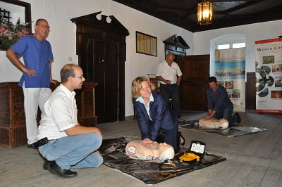 Alexander Sedlmair vom BRK führte außerdem die Anwendung eines Defibrillators vor. Diese stehen an zunehmend mehr Standorten zur Verfügung. So gibt es am Mühldorfer Stadtplatz zwei für die Öffentlichkeit zugängige Apparate: einen im Eingangsbereich des Rathauses und einen im Selbstbedienungsbereich der VR-Bank, Stadtplatz 43.