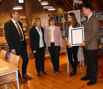 In der Stadtbücherei der Kreisstadt Mühldorf am Inn wird seit Januar 2009 die staatlich anerkannte dreijährige Berufsausbildung Fachangestellte/r für Medien- und Informationsdienste (FaMI) angeboten. Regina Kaiser, die Leiterin der Stadtbücherei erhielt jetzt ein Zertifikat von Herrn Dr. Andreas Dahlem, einem Mitarbeiter der Bayerischen Staatsbibliothek, überreicht. Die Bayerische Staatsbibliothek ist die übergeordnete, zuständige Stelle für den Ausbildungsberuf und würdigt mit diesem Zertifikat das Engagement von Frau Kaiser als Sprecherin des Qualitätszirkels der FaMI-Ausbilder/innen. Sie wird als kompetente, erfahrene Gesprächspartnerin zu Fragen der bibliothekarischen Ausbildung sehr geschätzt. Gerade für diesen noch relativ jungen Ausbildungsberuf ist es von zentraler Bedeutung, dass durch regen Erfahrungsaustausch an der grundsätzlichen Weichenstellung für die Zukunft gearbeitet wird.