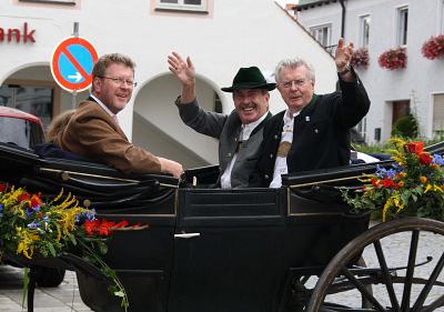 Bereits der Volksfestauszug war das erste Highlight. Hatte es kurz zuvor noch geregnet, klarte der Himmel rechtzeitig auf, so dass die vielen Zuschauer auf dem Stadtplatz und an der weiteren Wegstrecke zum Volksfestplatz den bunten Zug mit seinen über 900 Teilnehmern so richtig genießen konnten. Neben den Kutschen der Politprominenz und der vier Wies’n-Wirte, und den Oldtimern der Mühldorfer Oldtimerfreunde mit den Stadträten, konnte auch der dreispännige Wagen der Spatenbrauerei, der sonst nur noch auf dem Oktoberfest zum Einsatz kommt, bewundert werden. Für weitere Abwechslung sorgten die farbenprächtigen Schützen-, Trachten- und Musikgruppen und Abordnungen verschiedener anderer Vereine.