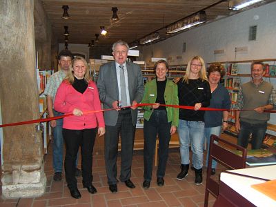 Am 23. 11.2010 durchschnitt Bürgermeister Knoblauch im Beisein der Büchereimitarbeiter und -mitarbeiterinnen das rote Band zur Eröffnung