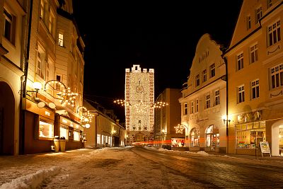 Das Mühldorfer Wahrzeichen, der Nagelschmiedtum, verwandelt sich in der Vorweihnachtszeit zu einem in hellem Licht erstrahlenden Weihnachtsturm, der Jung und Alt verzaubert. Fast 40.000 LEDs und 4.950 Meter Kabel verwandeln den Turm in ein funkelndes Lichtermeer. Das ist in Bayern einzigartig und macht Mühldorf zu einer der schönsten vorweihnachtlichen Städte in Bayern.