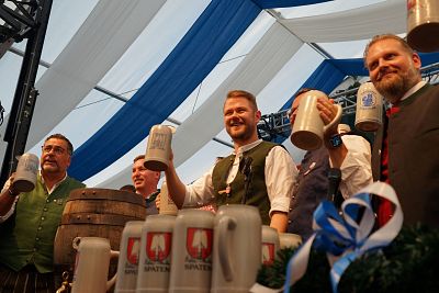 Seit Freitagabend, 18:45 Uhr läuft das Mühldorfer Traditionsvolksfest. Mit zwei Schlägen zapfte Bürgermeister Michael Hetzl im Spaten-Festzelt das erste Festbier-Fass an. Im Beisein von Volksfestkönigin Julia Huber, Volksfestorganisator Walter Gruber, Festwirten und Ehrengästen eröffnete der Bürgermeister das Volksfest mit einem lauten „O‘ zapft is“. Daraufhin brach sich im prall gefüllten Zelt lautstarke Begeisterung Bahn. „Wie die Besucherinnen und Besucher fiebern auch wir seit Wochen dem Start entgegen“, sagt Michael Hetzl. „Wir freuen uns sehr, dass es jetzt endlich soweit ist.“ Kulturamtsleiter Walter Gruber pflichtet bei: „Wirte, Schausteller und sämtliche Beteiligte – alle hier sind bereit. Das Wichtigste bis zum Volksfestausklang am 9. September ist jetzt, dass die Gäste von nah und fern sich wohlfühlen und Spaß haben. Insgesamt rechnen wir mit 250.000 Besucherinnen und Besuchern unseres Traditionsvolksfests.“ Am Freitagabend nach dem Anzapfen klappte das mit dem Spaßhaben nahtlos – mit Funky Peter & Birkdobler im Spaten-Festzelt, The Soundscape im Erhartinger-Festzelt und der Heldensteiner HeuBodnBlosn im Innbräu-Festzelt.