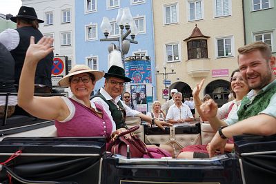 Stimmungsvoll war es mit den Feierlichkeiten am Freitag bereits gegen 17.30 Uhr mit dem traditionellen Standkonzert der Blaskapelle Altmühldorf und der Stadtkapelle Mühldorf vor dem Rathaus losgegangen. Kurz darauf begann der Große Volksfestauszug. Hunderte Zuschauer am Stadtplatz jubelten den geschmückten Kutschen und Gespannen mit der Volksfestkönigin und den Festwirten, den Musikkapellen, Schäfflern und Goaßlschnoizern zu. Am Zielort Volksfestplatz spielte zum Empfang im Spaten-Festzelt die Blaskapelle Altmühldorf auf. „Insgesamt ein wunderbarer und rundum gelungener Auftakt bei Kaiserwetter“, lautet das erste Zwischenfazit von Bürgermeister Michael Hetzl. „Schön, dass alle zusammen friedlich feiern.“ Walter Gruber ergänzt: „Sicherheitstechnisch haben wir bislang keine besonderen Vorkommnisse.“