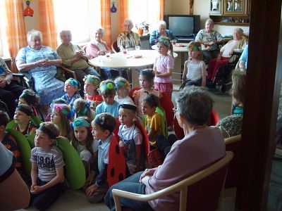 Schon lange vorher hatten die Jungen und Mädchen zusammen mit ihren Erzieherinnen, Frau Lang und Frau Nestle-Haindl, hierfür zwei Tänze vorbereitet. Als sie dann vor den Bewohnern ihren Käfer- und ihren Blumentanz vorführen konnten, waren sie zu Recht stolz auf ihren Erfolg. Die Heimbewohner bewunderten die schöne Vorstellung und applaudierten am Ende fröhlich und von ganzem Herzen. Danach sangen die Kinder zusammen mit den Bewohnern Lieder, die schon Liedgut waren, als die Bewohner selbst noch so jung waren wie die Besucher des heutigen Tages.