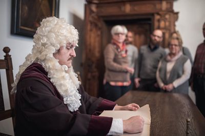 Die Besucher erwartet im Inneren eine Turmuhrenausstellung, ein hölzernes Stadtmodell