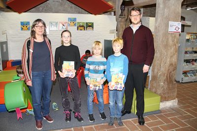 1. Bürgermeister Michael Hetzl überreichte zusammen mit der Büchereileitung Regina Kaiser den drei ausgelosten Gewinnerkindern je ein Kinderkochbuch mit einer Kochschürze zum selber bemalen.