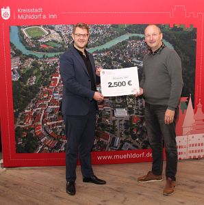 Einen Spendenscheck in Höhe von 2.500 Euro überreichte Mühldorfs 1. Bürgermeister Michael Hetzl an den Leiter der Mühldorfer Tafel, Detlef Künzel.