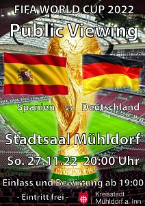 Am ersten Adventssonntag, den 27. November, 20 Uhr, trifft die deutsche Nationalmannschaft im Al Bayt-Stadion beim zweiten WM-Gruppenspiel in der Gruppe E auf den ewigen Rivalen Spanien. Zu diesem Top Spiel lädt die Kreisstadt Mühldorf zum Public Viewing in den Stadtsaal ein - für Bewirtung ist gesorgt.