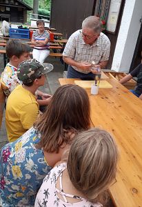 „Summ, summ, summ – Bienchen summ herum!“ Dieses Lied oder die „Biene Maja“ kennt jeder doch einen echten Bienenhof haben bis jetzt nur wenige Kinder besucht. 25 Mühlix-TeilnehmerInnen hatten an zwei Terminen im August die Möglichkeit, den Bienenhof Aham zu besuchen. Andy Hewitson vom Kreisverband Bayerischer Bienenzüchter Mühldorf-Altötting zeigte ihnen, wie die Bienen leben, wie das Bienenvolk aufgebaut ist und wo die Königin zu finden ist. Die Kinder konnten sich auch in der Imkerei ausprobieren und ein Rähmchen für den Bienenstock bauen. Natürlich durfte am Schluss auch die von den Bienen produzierte Leckerei, nämlich der Honig, probierte werden.