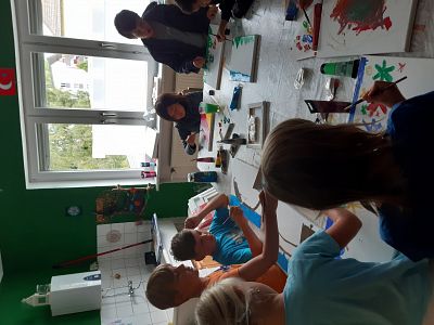 Anschluss konnten die TeilnehmerInnen Turnbeutel, T-Shirts, oder auch von Zuhause mitgebrachte Textilien nach ihren Vorstellungen gestalten. Dabei war der Kreativität keine Grenze gesetzt. Am Ende durften die Kinder die individuell