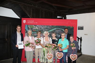 In einem kleinen Festakt ehrte die Kreisstadt Mühldorf a. Inn den katholischen Frauenbund für 100-jährige Teilnahme auf dem Mühldorfer Traditionsvolksfest. Der katholische Frauenbund war mit seinem Losstand ein fester Bestandteil auf dem Volksfestplatz. Bürgermeister Michael Hetzl und Volksfestorganisator Walter Gruber bedankten sich bei den Verantwortlichen und den aktiven Losbudenbetreibern für die langjährige und sehr gute Zusammenarbeit. Der 1. Bürgermeister überreichte den anwesenden Frauen je einen kleinen Blumenstrauß, ein Volksfestherz, einen Geschenkkorb und eine Urkunde. Leider betrieb der Frauenbund im Jahr 2019 letztmals ihre Losbude. Eine Wideraufnahme des Losstandes nach zweijähriger, corona-bedingter Pause war aufgrund Personalmangel nicht mehr möglich.