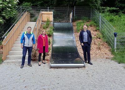 „Die Mitarbeiter haben das Konzept selbst entwickelt“, erklärt Bauhofleiter Wolfgang Huber. „Insgesamt waren vier Gewerke - Maurer, Schreiner, Schlosser und Gärtner - mit insgesamt etwa 200 Arbeitsstunden an der Rutsche beteiligt.“ Die Anlage werde bereits gut angenommen. 1. Bürgermeister Michael Hetzl zeigte sich sehr erfreut über das erneuerte Spielgerät und lobte die Arbeit des städtischen Bauhofs. Auch Stadtbaumeisterin Birgit Weichselgartner zeigte sich begeistert von der Anlage, die durch die Verkleidung, die neu angelegte Treppe und die seitlichen Bepflanzungen viel Sicherheit für die Kinder bietet.