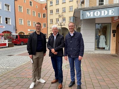 Mühldorf a. Inn. Auf Einladung von 1. Bürgermeister Michael Hetzl trafen sich Waldkraiburgs 1. Bürgermeister Robert Pötzsch und Neumarkt-St.Veits Rathauschef Erwin Baumgartner vor kurzem am Mühldorfer Stadtplatz, um gemeinsam die neue GPS-Tour „Ein Hofstaat auf Reisen“ mit dem Handy zu erleben.