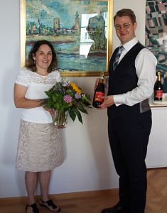 1. Bürgermeister Michael Hetzl gratulierte Stadträtin und Referentin für Senioren und Soziales, Claudia Hausberger, mit einem Blumenstrauß, Gutscheinen der Mühldorfer Aktionsgemeinschaft und einer Flasche Sekt zum 50. Geburtstag.