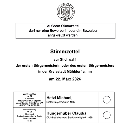 In der Bürgermeister-Stichwahl am Sonntag, 22. März, treten Amtsinhaber Michael Hetzl und Herausforderin Claudia Hungerhuber gegeneinander an. Die Gewählt wird wieder von 8 bis 18 Uhr. Wer zur Urnenwahl kommt, bringt bitte ein Ausweisdokument und die Wahlbenachrichtigung der Kommunalwahl mit. Wer sich nicht identifizieren kann, darf nicht wählen. Wer außerdem die Wahlbenachrichtigung mitnimmt, kann dort jederzeit sein zugeteiltes Wahllokal nachlesen und beschleunigt die organisatorischen Abläufe in den Wahlräumen. Die Benachrichtigung ist aber keine Voraussetzung dafür, wählen zu dürfen. Auch wer sie nicht dabei hat, kann mit Ausweis, Reisepass oder Führerschein problemlos im richtigen Wahllokal wählen. Wer sich noch spontan neu für die Briefwahl entscheidet, kann die Unterlagen bis Freitag, 20. März, um 15 Uhr im Bürgerbüro der Kreisstadt Mühldorf a. Inn abholen. Für Rückfragen steht das Wahlamt telefonisch unter 08631/612-414 zur Verfügung.