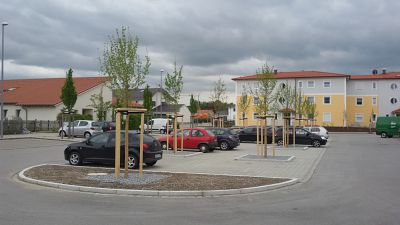 Mit Fertigstellung der angrenzenden Wohnbebauung wurden von der Stadt Mühldorf a. Inn abschließend Parkplätze und Grünflächen mit Baumpflanzungen anlegt. Es sind 20 neue Parkplätze entstanden und es wurden 11 Bäume gepflanzt. Die Grünflächen sind mit Granithochborden eingefasst, die Parkflächen mit Rasenfugenpflaster befestigt.
