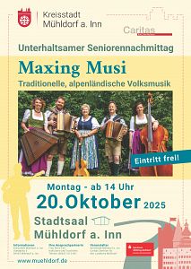 Beim Unterhaltsamen Seniorennachmittag im Stadtsaal geht es heuer zünftig zu. Am Montag, 20. Oktober, ab 14 Uhr spielt die „Maxing Musi“ auf, wenn die Kreisstadt Mühldorf a. Inn in Zusammenarbeit mit dem Caritas-Zentrum zum geselligen Miteinander einlädt. Bürgermeister Michael Hetzl, Seniorenreferentin Claudia Hausberger und Caritas-Kreisgeschäftsführerin Alexandra Bohn freuen sich schon, viele Mühldorferinnen und Mühldorfer zu begrüßen. „Für viele Menschen ist der Seniorennachmittag jedes Jahr ein Höhepunkt im Kalender“, sagt Bürgermeister Michael Hetzl. „Besonders macht ihn, wie abwechslungsreich es dabei zugeht. Es gelingt uns jedes Jahr, etwas Neues zu bieten: Vor zwei Jahren hatten wir gediegene Evergreens und Tango als Geigen- und Akkordeonklänge, vergangenes Jahr Zauberkunst und heuer gibt es traditionelle Volksmusik.“