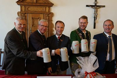 Los ging das Programm bereits am Vormittag mit dem Festakt und dem Empfang der auswärtigen Gruppen vor dem Rathaus. Bürgermeister, Volksfestorganisator und Volksfestkönigin Simona Kneißl empfingen unter anderem die Musikkapelle Waidbruck aus Südtirol, die Bürgergarde und die Bindertänzer der Stadt Salzburg, die Tanzgruppe Palucenka aus Rumänien, die Grupo Folklórica Sol Naciente und die Tölzer Schützenkompanie mit Spielmannszug. Der Mühldorfer Trachtenverein Edelweiß und die St. Hubertus Schützengarde aus Harsewinkel zelebrierten ihre seit 50 Jahren bestehende Freundschaft. Ein Salut vom Stadtplatz gab es von der Königlich privilegierten Feuerschützengesellschaft, die Schützengesellschaft Mößling böllerte vom Nagelschmiedturm. Nach einem Empfang im Rathaus startete um 13 Uhr der Schützen- und Trachtenzug, der im Spaten-Festzelt endete. Dort hatten die beiden Bürgermeister nochmals die Gelegenheit, auf die Städtepartnerschaft anzustoßen – aus Maßkrügen, die diese Verbindung abbilden. „Es ist immer wieder großartig mitzuerleben, dass so viele Menschen von weither anreisen, um mit den Mühldorferinnen und Mühldorfern zu feiern“, lautet das Fazit von Bürgermeister Michael Hetzl.
