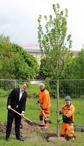 Gemeinsam mit Florian Piloty und Alfred Raab vom städtischen Bauhof pflanzte Erster Bürgermeister Michael Hetzl den Zwetschgenbaum. Mittlerweile wachsen schon einige Obstbäume auf der Streuobstwiese zur Freude der Spaziergänger, die in den Genuss einer abwechslungsreichen Ernte von Kirsche, über Apfel bis hin zur Birne kommen.