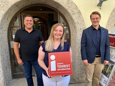 Erster Bürgermeister, Michael Hetzl, Walter Gruber, Leiter der Touristinfo und des Kulturbüros und Verena Rögner, Fachbereichsleitung Tourismus, freuen sich über das Ergebnis des Prüfverfahrens. „Wir sind stolz darauf, die Qualitätskontrolle erfolgreich gemeistert und uns auch in den unangekündigten Tests so gut bewährt zu haben,“ so Bürgermeister Michael Hetzl. Die Touristinfo Mühldorf a. Inn darf nun drei Jahre lang mit der i-Marke werben. Im Jahr 2023 steht dann eine erneute, umfangreiche Überprüfung an.
