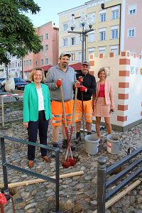 Felgenschonende Anlehnbügel für Fahrräder werden derzeit von Mitarbeitern des Bauhofes am Stadtplatz angebracht. Insgesamt 30 Anlagen, sogenannte „Mühldorfer Bügel“ - abgestimmt auf die Vorgaben des Landesamtes für Denkmalschutz und Landespflege mit vom Bauhof entwickelten Bodenhülse n– werden in der Innenstadt sukzessive aufgebaut. „Wir wollten gerundete Kanten, damit die Verletzungsgefahr minimiert wird“, erklärt Erste Bürgermeisterin Marianne Zollner und Stadtbaumeisterin Birgit Weichselgartner fügt hinzu: „Bei den bestehenden Konstruktionen werden die Felgenhalter abgebaut, sodass eine Abgrenzung zu den parkenden Autos beibehalten wird.“