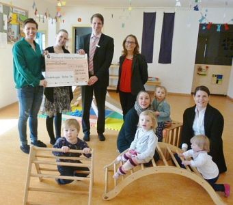 Gemeinsam mit der stellv. Filialleiterin, Frau Prasser, überreichten sie der Krippenleiterin Elisabeth Marsch und dem Elternbeirat einen Scheck über 1.500,-€.