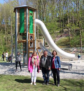 Gerade rechtzeitig zu Beginn der Osterferien konnten die Mitarbeiter des städtische Bauhof den Rutschenturm auf dem Spielplatz am Stadtwall aufstellen. Der Turm ist fast 7 Meter hoch und man kann auf unterschiedlichen Leitern zu den verschiedenen Ebenen des Turms und zu den beiden Rutschbahnen klettern. Ein bisschen Mut erfordert es schon, beim ersten Mal aus ca. 5 Metern Höhe in der Röhre wieder zu Boden zu rutschen, aber dann macht es nur noch Spass! „Diese neue Attraktion lockt Kinder aus dem ganzen Stadtgebiet auf den Spielplatz,“ freut sich Bürgermeisterin Zollner.
