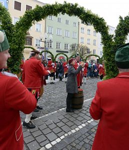 Dieses Jahr ist es wieder soweit. Nach sieben Jahren führen die Mühldorfer Schäffler ihren traditionellen Tanz in und um Mühldorf auf. Seit 1862 pflegen sie diese Tradition, worauf die Kreisstadt Mühldorf a. Inn sehr stolz ist. Auch vor dem Rathaus tanzten sie schon auf. Anschließend wurden sie von der Bürgermeisterin Marianne Zollner begrüßt und zu einem kleinen Empfang ins Rathaus gebeten.