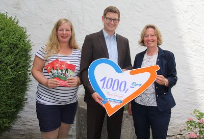 Bürgermeisterin Marianne Zollner (rechts im Bild) und Jugendzentrumsleiterin Agnes Sarr (links im Bild) bedanken sich bei Michael Kierner, dem Geschäftsstellenleiter der Sparda Bank Mühldorf, für die großzügige Spende zur Unterstützung des Mühldorfer Ferienprogramms Mühlix 2018 in Höhe von 1.000 €.