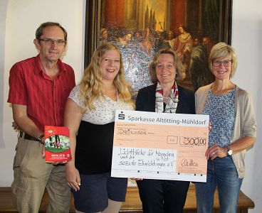 Auch dieses Jahr unterstützt der Verein „Lichtblicke für Menschen in Not und für soziale Einrichtungen e.V.“ wieder das Mühldorfer Ferienprogramm „Mühlix“ mit einer Spende in Höhe von 300 Euro. Bürgermeisterin Marianne Zollner und Jugendzentrumsleiterin Agnes Sarr freuten sich sehr über die finanzielle Zuwendung, die für die Betreuung von Mühldorfer Kindern und Jugendlichen in den Sommerferien verwendet wird und bedankten sich herzlich bei der Vorsitzenden des Vereins, Frau Monika Chittka (rechts im Bild) und dem Schriftführer des Vereins, Karl Ebenbichler (links im Bild).