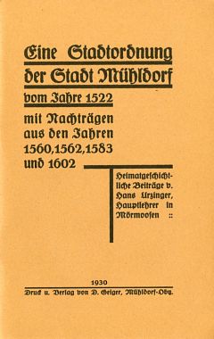 Eines der wertvollsten Dokumente des hiesigen Archivs im Rathause ist das in der Ueberschrift genannte. Stadtgeschichtlich bedeutet es eine wertvolle Ergänzung zum Mühldorfer Stadtrecht aus dem 13. Jahrhundert, abgedruckt in den "Heimatblättern" vom Jahre 1928.