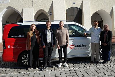 Die Kreisstadt Mühldorf a. Inn zieht eine sehr positive Zwischenbilanz für den im Mai gestarteten Regelbetrieb des Rufbusses. Ab spätestens Mitte November sind alle Fahrzeuge auch klar am eigenen Design erkennbar unter dem Namen „InnLiner“ unterwegs, die Rufbus-App trägt mittlerweile ebenfalls diesen Eigennamen. Bürgermeister Michael Hetzl, Daniela Goldbacher von der Stadtverwaltung sowie Marvin Schmiege, Nikita Chernyshov und Fati Aledji vom Dienstleister Via Mobility aus Berlin präsentierten die frisch gestalteten Fahrzeuge jetzt der Öffentlichkeit.