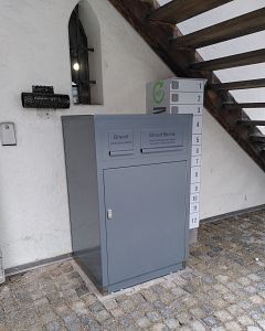 Die Stadtbücherei erfüllt den lang gehegten Wunsch vieler Nutzerinnen und Nutzer nach einem Rückgabekasten direkt vor Ort. Dank des neuen Rund-um-die-Uhr-Services können Bücher und elektronische Medien ab sofort auch außerhalb der Öffnungszeiten abgegeben werden. Der graue Schrank steht an der Eingangstür zum Kornkasten neben der Ausleihbox. Er hat ein Fach für die Rückgabe elektronischer Medien und eines für Bücher. Letztere müssen mit dem Buchrücken zuerst eingeworfen werden, um Beschädigungen zu vermeiden. Die Rückgabe erfolgt auf eigenes Risiko und ist nur für Medien der Stadtbücherei möglich. Ist die Rücknahmekapazität erschöpft, verriegeln die Schubladen automatisch. Die Stadtbücherei bietet nun insgesamt zwei Rückgabeboxen an. Bereits seit 2017 steht eine 24-Stunden-Rückgabe am Bahnhof.